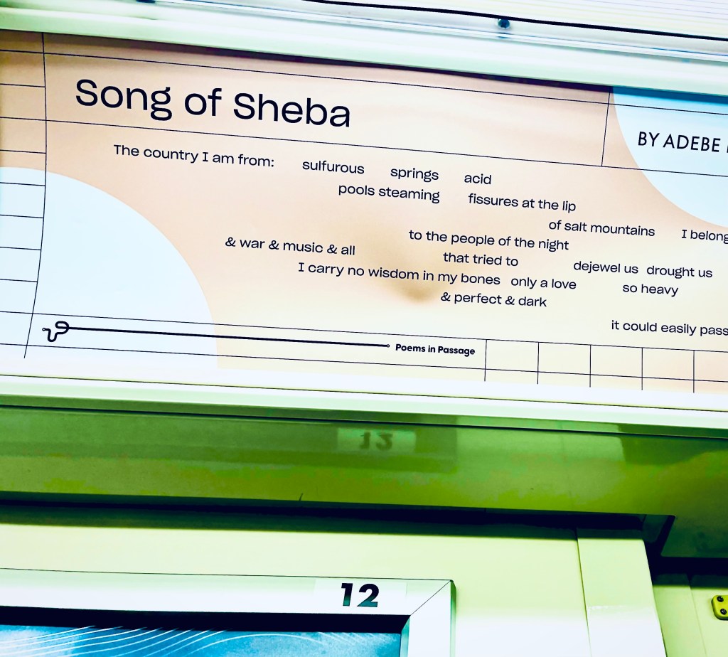 “Aria Apocalypta,” a poem from her current/in-progress work, was longlisted for the 2023 CBC Poetry Prize. Her poem “Song of Sheba” was featured on Toronto transit (buses, trains, and streetcars) in 2024, thanks to the Poems in Passage program (in collaboration with the TTC).